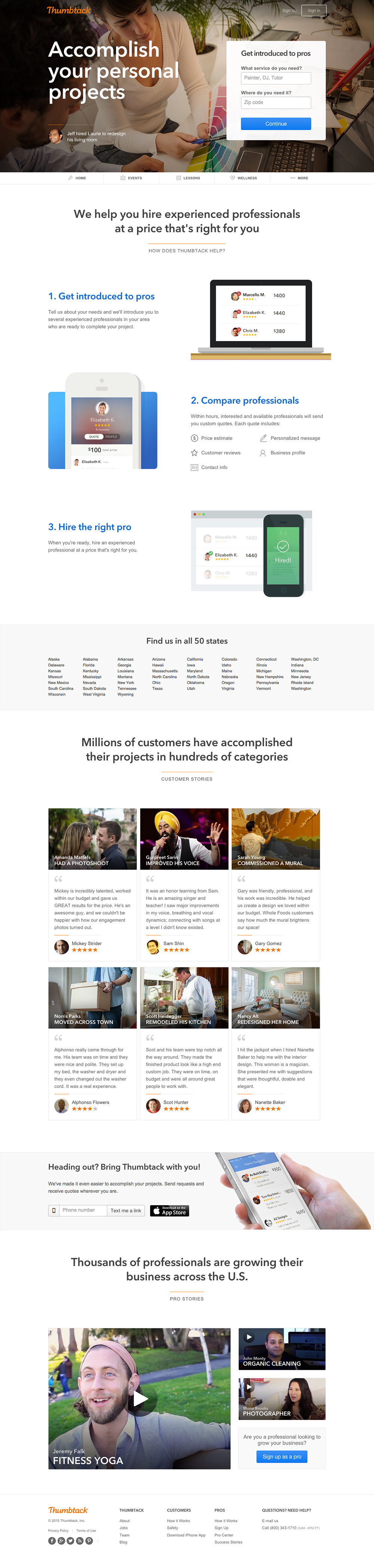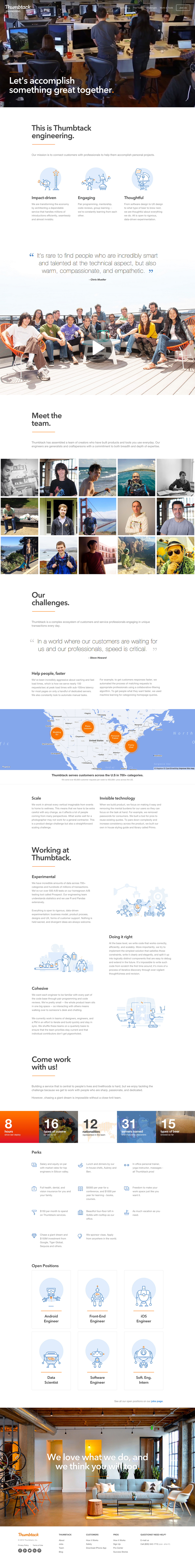 That page was designed to communicate Thumbtack's engineering culture and help recruit more awesome people. It's one of my favorite projects because I had a chance to wear many hats: designer, art director, front-end engineer, photographer and videographer.